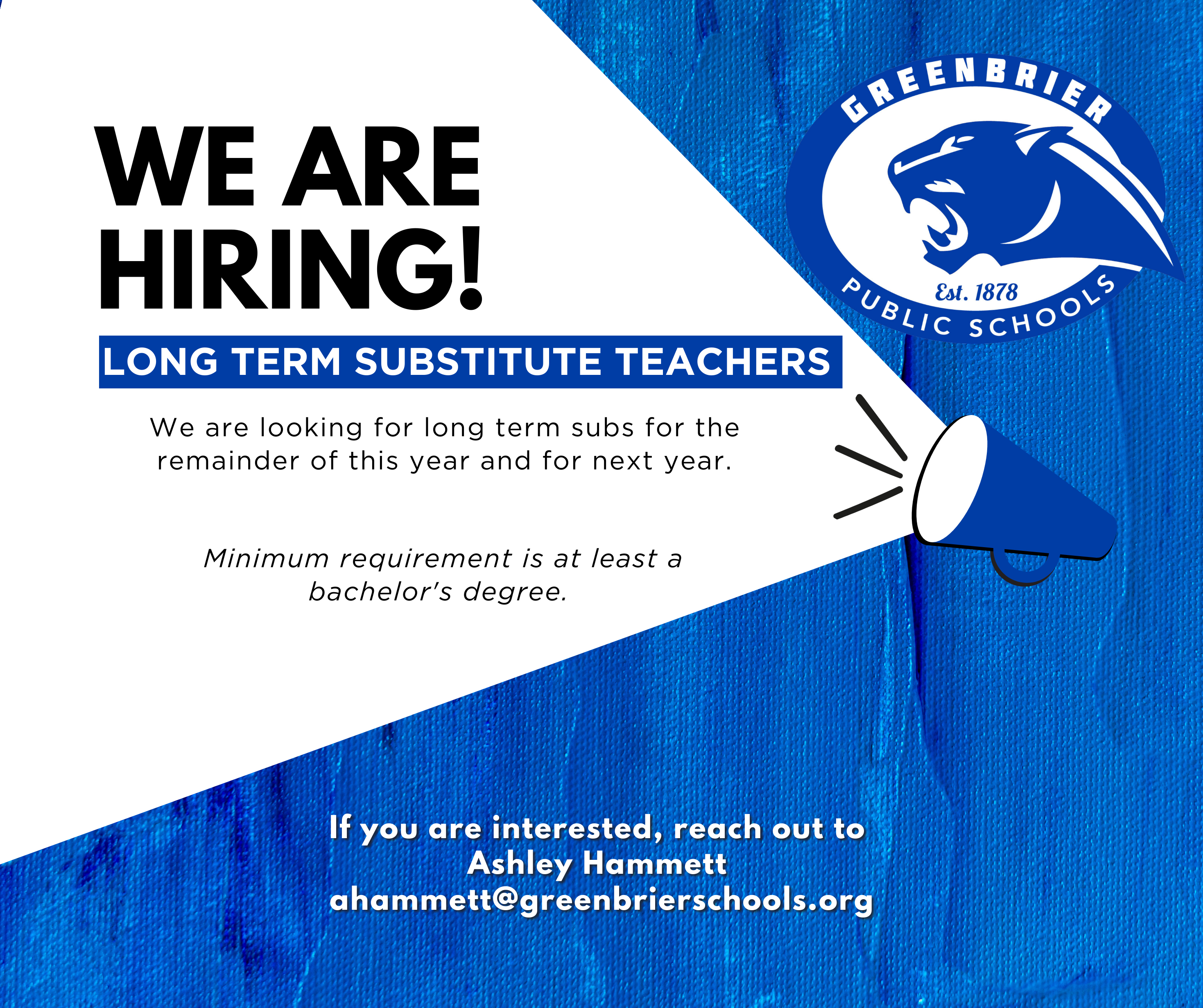 We are in need of long term substitutes! Reach out to Ashley Hammett at ahammett@greenbrierschools.org if you are interested.