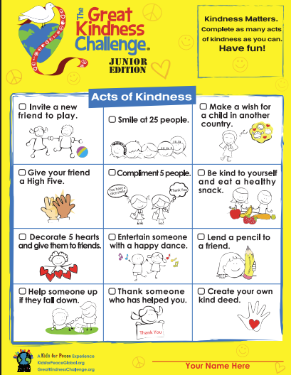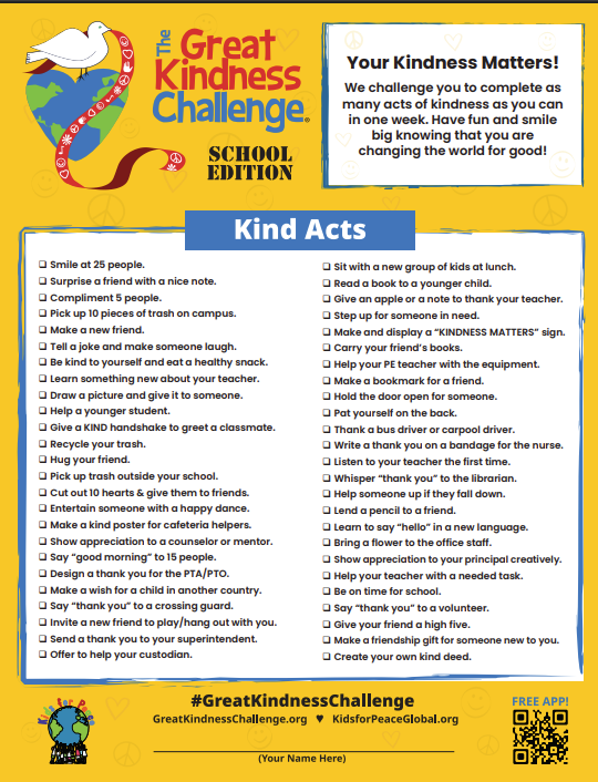 This week, we start The Great Kindness Challenge. Your child will be bringing home a checklist of things to complete to show kindness at school, at home and in our community. Students can turn the checksheet into Mrs. Hodges by the end of the week to earn a prize. There will be a grades 3-5 version and a K-2 version. We have lots of things planned and can’t wait to see our students go out of their way to show Kindness to others.
