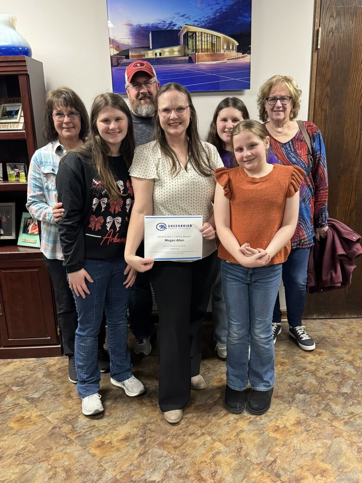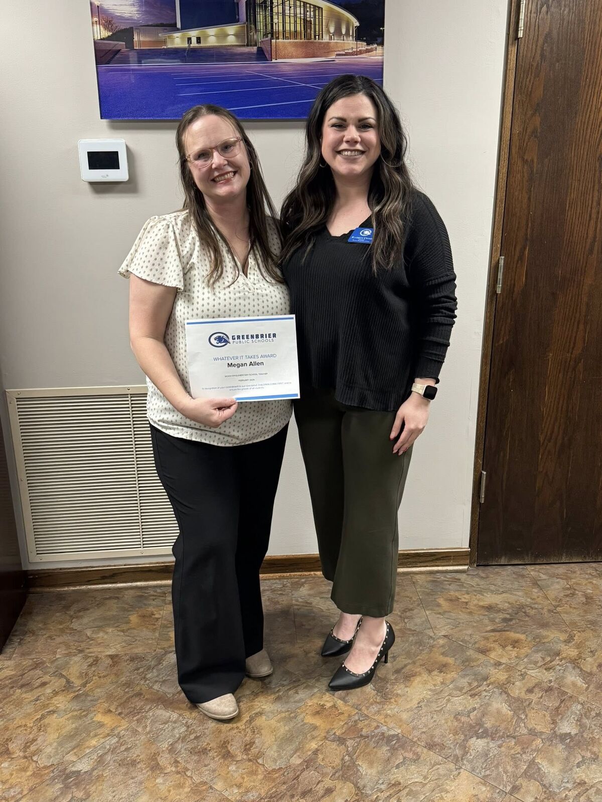 It is with great enthusiasm that we present Megan Allen for the Greenbrier School District’s Whatever It Takes Award. Ms. Allen is the embodiment of our core belief that children come first, consistently going above and beyond to ensure every student receives exactly what they need to succeed. She regularly invests time outside of the school day analyzing student data, anticipating learning gaps, and intentionally designing instruction that explicitly meets the needs of individual learners.